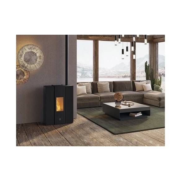 Raumluftunabhängiger und platzsparender Pelletofen mit nur 30 cm Tiefe, ideal für den Flur, aber für jeden Raum im Haus geeignet, mit Tür und vorderen Einsätzen aus Stahl.