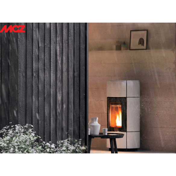 Kanalisierbarer Pelletofen mit schlichter Keramikverkleidung (Weiß, Warmgrau, Bordeaux, Schwarz) und einer tieferen und höheren Feuerstelle, die der natürlichen Bewegung der Flamme folgt. Besonders geeignet für die Eckaufstellung.