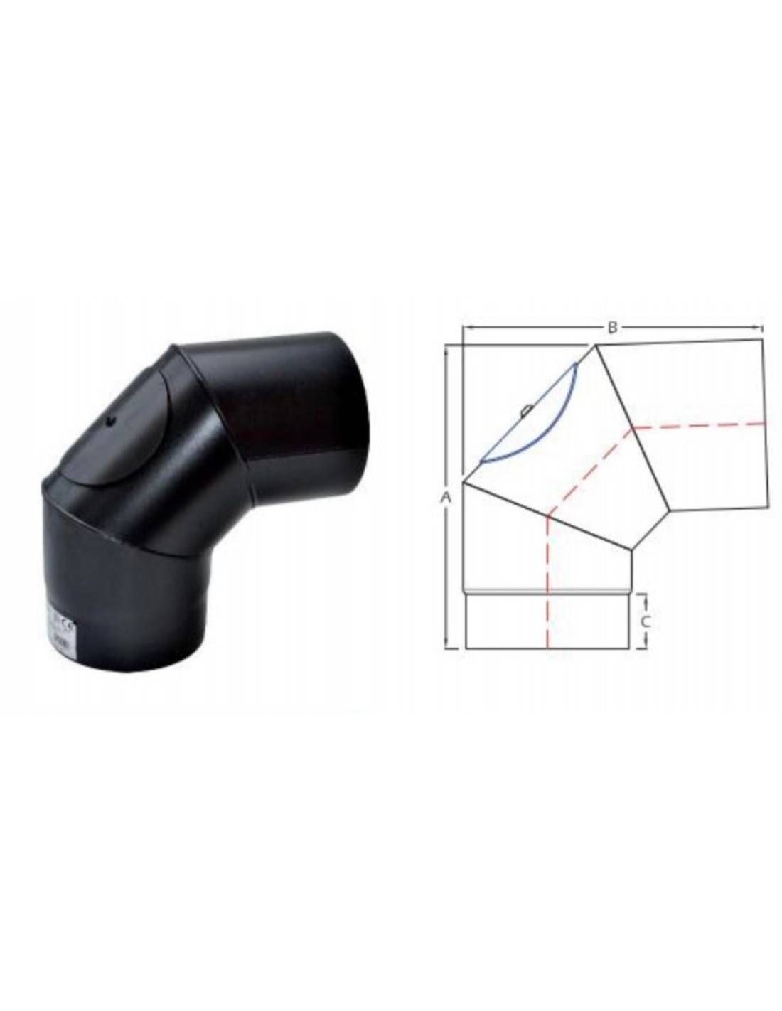 Eckelement mit Revisionstür und Dichtung, das die Richtung des Rauchrohrs um 90° ändert und die Inspektion und Reinigung des Rohrs selbst ermöglicht.