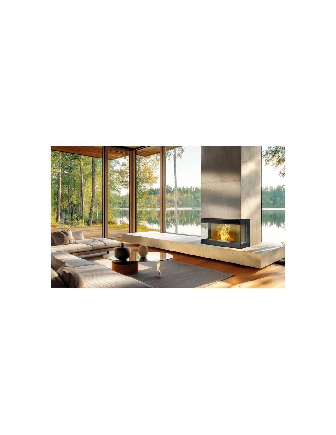 Pellet-powered monoblock fireplace dedicated to air heating of rooms.