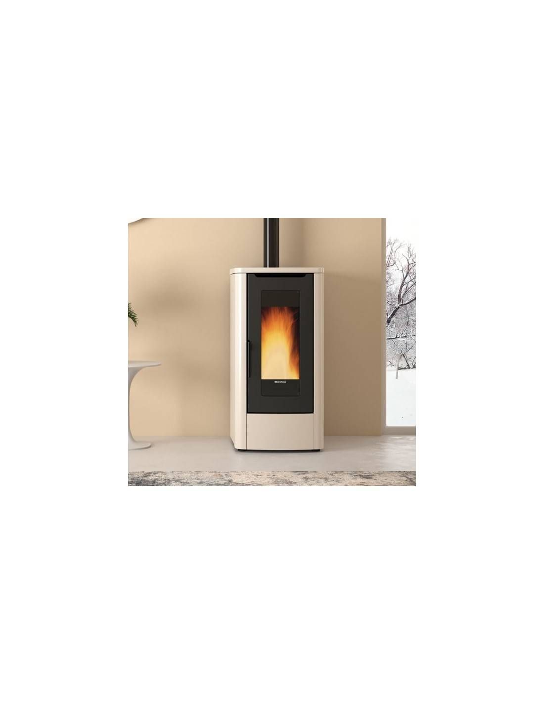 Versatile to install, it offers the option of a top or rear flue outlet. The modern design and steel and majolica finishes (burgundy, ivory, black) make it suitable for any space. It features a large 27 kg tank, ash compartment, and dual ducting with two dedicated motors for up to 8 meters, thermostatically controlled and with the option of shutting off.