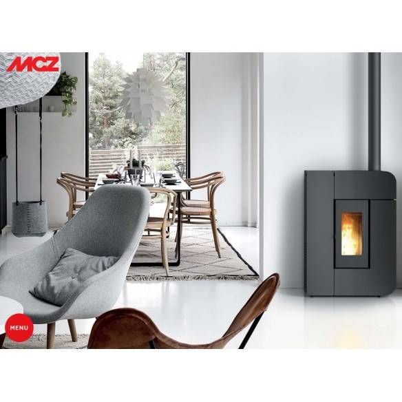 Affordable slim pellet stove from MCZ's "Easy" line, certified 5 stars, a complete range with basic finishes and electronics at the right price. Alea is a sealed, ventilated stove with a reduced depth (less than 28 cm), ideal for hallways and tight spaces. It features a cast iron door and steel cladding in Bordeaux, White, Silver, or Black. The brazier and firebox back panel are made of cast iron.