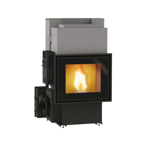 Pellet fireplace capable of heating water to power the heating system (radiators, towel warmers, radiant floor panels, etc.). Using a special optional kit, it is possible to activate the front hot air ventilation (modular and deactivatable) to heat the room where it is installed.