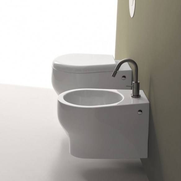 Sanitarios suspendidos (WC y bidet) en cerámica blanca brillo. Inodoro sin borde con toma de pared. Incluye asiento de inodoro termoestable delgado de cierre suave y liberación rápida. Dimensión sanitaria única L 35 XP 50 XH 33 cm.