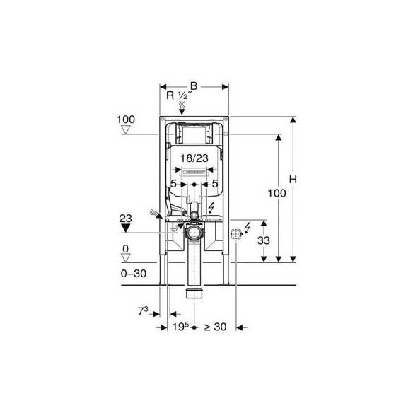 CODE D'USINE : 111795. Pression dynamique 0,1 à 10 bar. Température maximale de l'eau 25°C. Réglage par défaut de la quantité de rinçage 6 et 3 l. Plage de réglage du rinçage longue 4,5 / 6 / 7,5 L. Plage de réglage du rinçage courte 3-4 l. Équipement : Raccordement eau R 1/2", compatible MeplaFix, avec robinet d'arrêt et bouton intégrés. Protection chantier avec trappe de visite. Kit de raccordement WC, D. 90 mm. Coude technique 90° en PE-HD, D. 90 mm . Manchette de raccordement en PE-HD, D. 90/110 mm 2 capuchons de protection partielle ou totale.