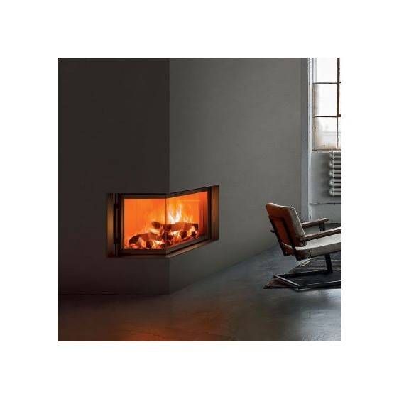 Cheminée d'angle à bois aux caractéristiques innovantes, performante et facile à utiliser.