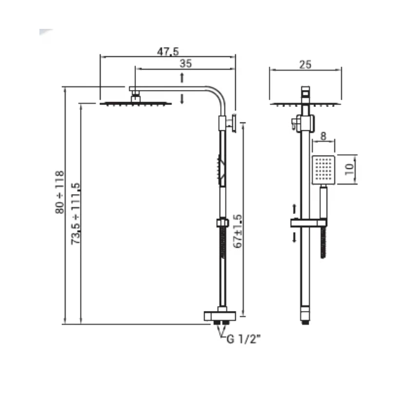 Douche mixte en acier chromé réglable en hauteur avec raccords muraux entraxe 69,5cm. Pomme de douche en acier inoxydable AISI 304, anticalcaire, diagonale 25 cm. Douchette à main en acier inoxydable AISI 304, anticalcaire, 8x10cm. Flexible inox, double emboîtement 150cm. Raccord flexible en inox, double sertissage 50cm. Mesures 25 x H 83-120 x 50,5 cm.