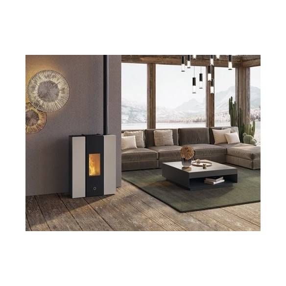 Poêle à granulés étanche « gain de place » avec seulement 30 cm de profondeur, idéal pour le couloir, mais adapté à tous les espaces de la maison, avec porte et inserts frontaux en acier.