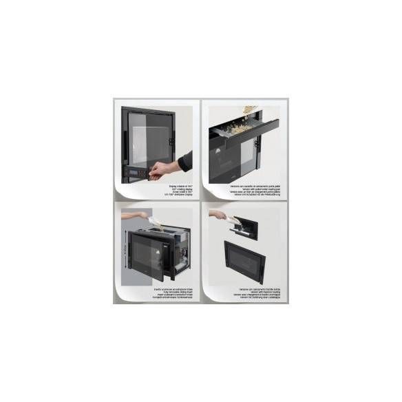 Il carico del pellet può avvenire estraendo l'inserto oppure dall'alto tramite botola (accessorio) o con cassetto estraibile (optional)