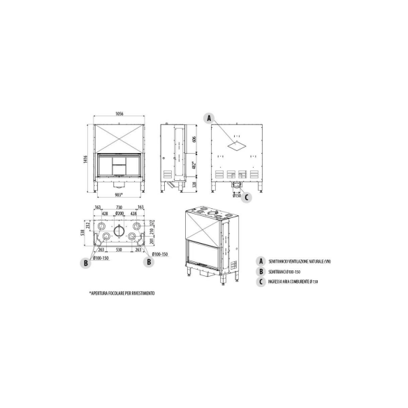 Gli ingressi d’aria comburente e di pulizia vetro sono interamente canalizzabili all’esterno rendendo il camino isolato rispetto all’ambiente d’installazione.