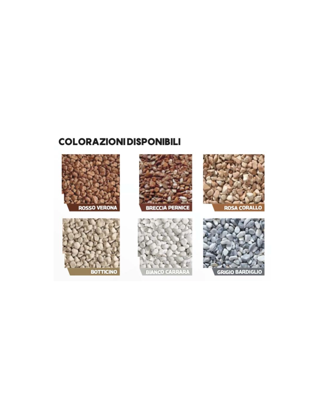 Colore ciottoli: bianco carrara, grigio bardiglio, botticino, rosa corallo, breccia pernice, rosso verona