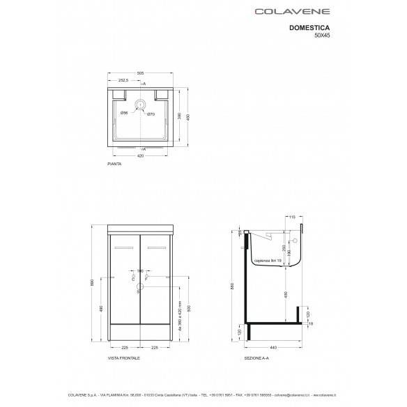 Il mobiletto lavapanni Domestica di Colavene ha una vasca per lavare a mano la biancheria e un vano contenitore sottostante con due ante. La vasca è in ABS metacrilato e non ha fori per il miscelatore, per poter scegliere se installarlo al piano o a parete. La dotazione della vasca include anche un asse per di lavaggio in legno massello, il sifone e il foro del troppopieno. Il vano contenitore sottostante risulta comodo per detersivi e secchi, o ogni altro prodotto per l'igiene domestica. La finitura del mobile è il color bianco tela effetto legno, colore neutro che consente l'installazione del prodotto in ogni ambiente e stile.