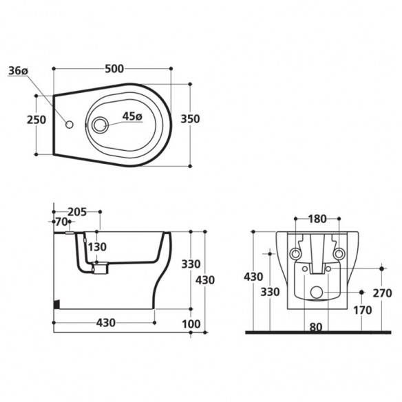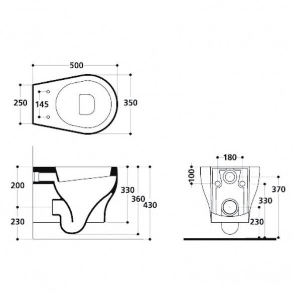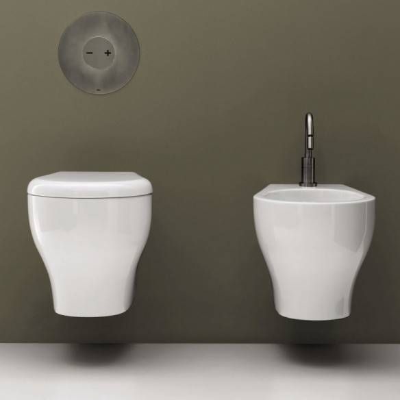 Sanitari (vaso e bidet) sospesi in ceramica bianca lucida. Vaso WC senza brida con scarico a parete. Copriwater in termoindurente a sgancio rapido slim soft-close incluso. Dimensione singolo sanitario L 35 X P 50 X H 33 cm.
