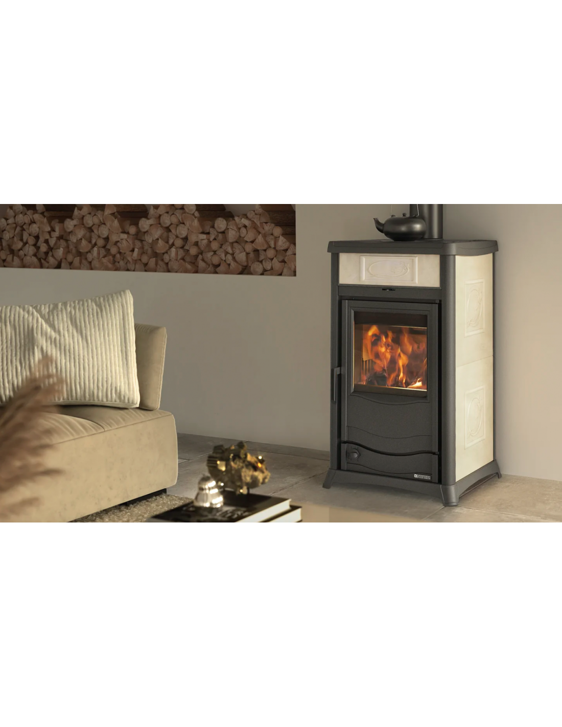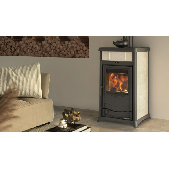 Caratteristiche:: • Focolare in acciaio / ghisa • Porta in ghisa smaltata • Cassetto cenere estraibile • Aria primaria e secondaria regolabile per migliore gestione combustione • Sistema di post-combustione per basse emissioni • Valvola termostatica aria • Vetro ceramico • Predisposizione per dispositivo di sicurezza DSA (valvola DSA optional)